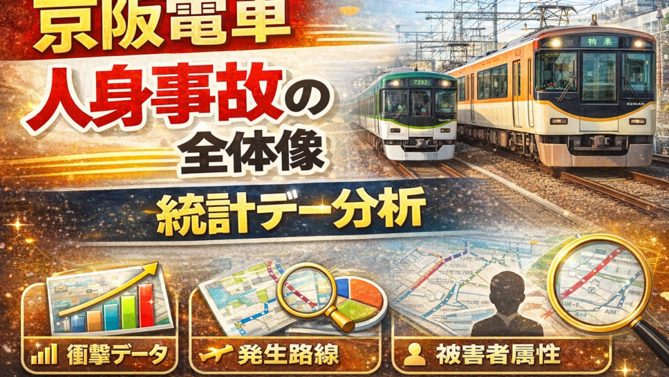 【京阪電車の人身事故や死亡事故が自分や家族の身近で起きる――そう考えただけで、不安や疑問を感じていませんか?】京阪電気鉄道の全3路線では、これまでに死亡8365件・重傷838件・軽傷1576件もの人身事故が発生しています。特に京阪本線では、...